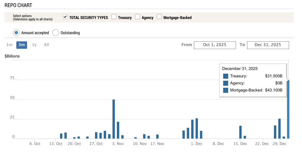 Banks piled into the Fed’s Standing Repo Facility, borrowing a record $74.6 billion on Dec. 31 for 2025. Overnight funding rates popped, the benchmark SOFR briefly hit 3.77%, the general collateral repo rate touched 3.9%.