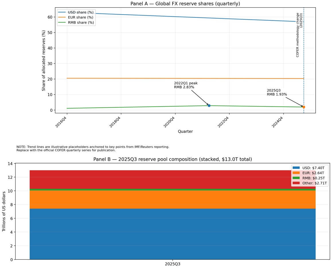 That translates to approximately $251 billion in a $13 trillion reserve pool, where the dollar still accounts for 56.92% and the euro for 20.33%.