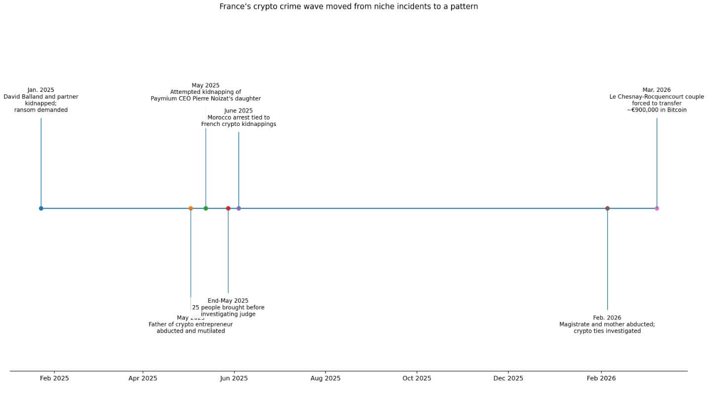 The 2026 attacks kept coming. In early February, a magistrate and her mother were abducted, with investigators focusing on the judge’s partner’s crypto ties. The Le Chesnay robbery followed weeks later.