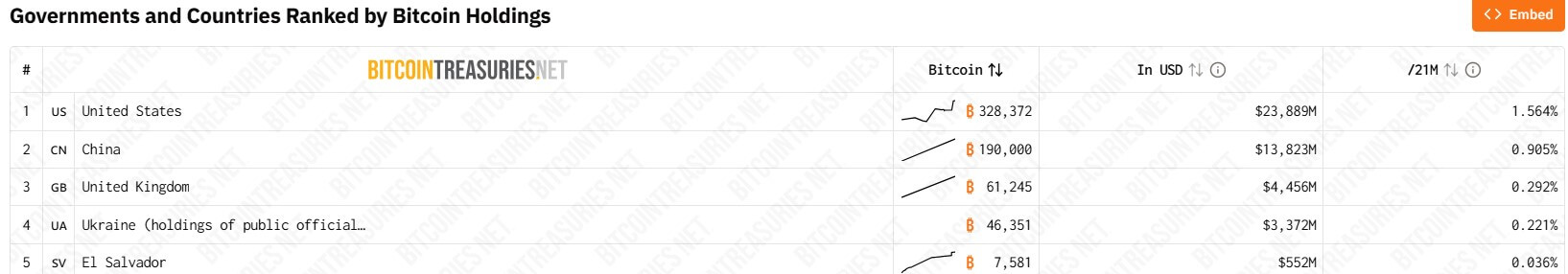 BitcoinTreasuries.net lists the United States, China, and the United Kingdom as the top three government holders of BTC.